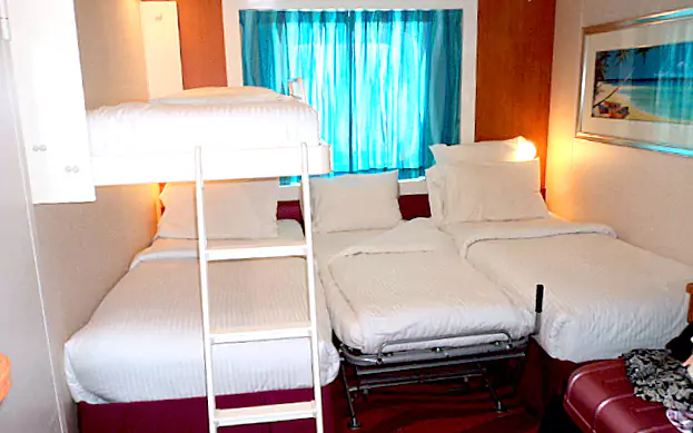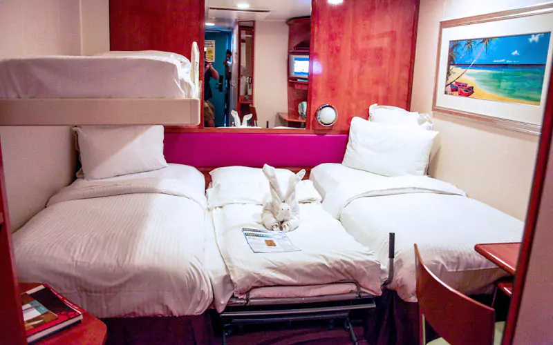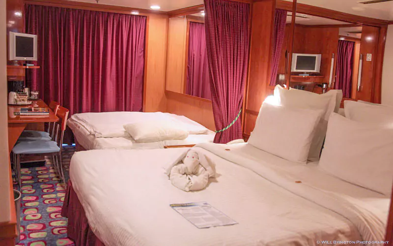 All staterooms include a TV, mini-fridge, safe, hair dryer, and climate control. Suites are offered based on timestamp priority. Show seating assignments vary by cabin type. VIP perks depend on the chosen stateroom.
